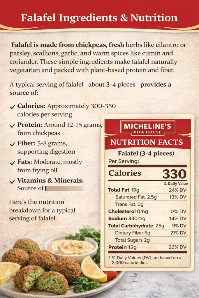 Falafel offers a balanced mix of plant-based protein, fiber, and satisfying fats—especially when eaten as part of a Mediterranean-style meal with vegetables and sauces. Below is a realistic nutrition snapshot to help you understand what’s in a typical serving.