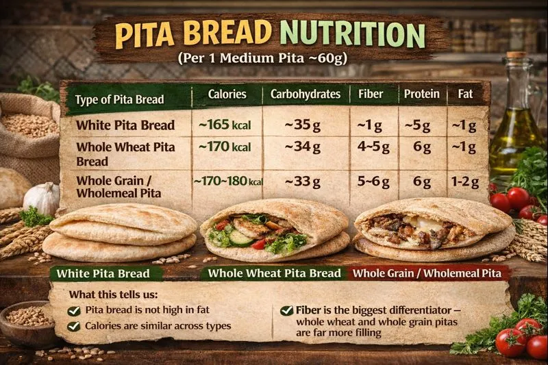 | Whole Grain / Wholemeal Pita | ~170–180 kcal | ~33 g | ~5–6 g | ~6 g | ~1–2 g |