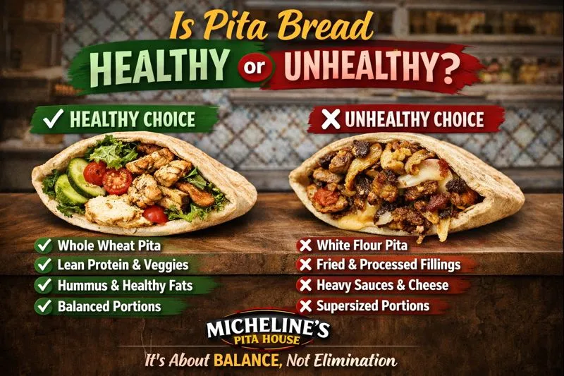 At Micheline’s Pita House, pita isn’t meant to be a heavy, carb-loaded centerpiece. It’s a supporting player — a warm, soft flatbread used to scoop hummus, wrap grilled proteins, and hold crisp vegetables together. When paired properly, pita bread can absolutely fit into a balanced, nourishing meal.