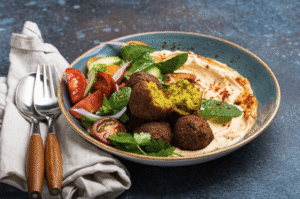 A typical Mediterranean meal often begins with small dishes meant for sharing. A Meza selection with dips, vegetables, and warm pita sets the tone. From there, the meal moves into heartier plates like Chicken Shawarma, Falafel, or a Combo Plate served with rice and salads. By the time dessert arrives, everyone is already satisfied, which is why Mediterranean desserts are intentionally modest.