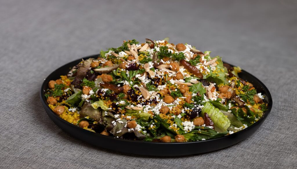Romaine and mixed greens, couscous (mixed with shredded zucchini, carrots + raisins), roasted beets, garbanzo beans, tossed in champagne vinaigrette, topped with feta cheese, dates, and almonds.