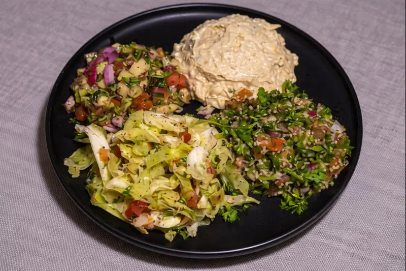 Many components—like our hummus, babagannoush, and cabbage salads—are naturally vegan. Some items may contain olive oil, herbs, or tahini. Always check with our team if you have dietary needs.